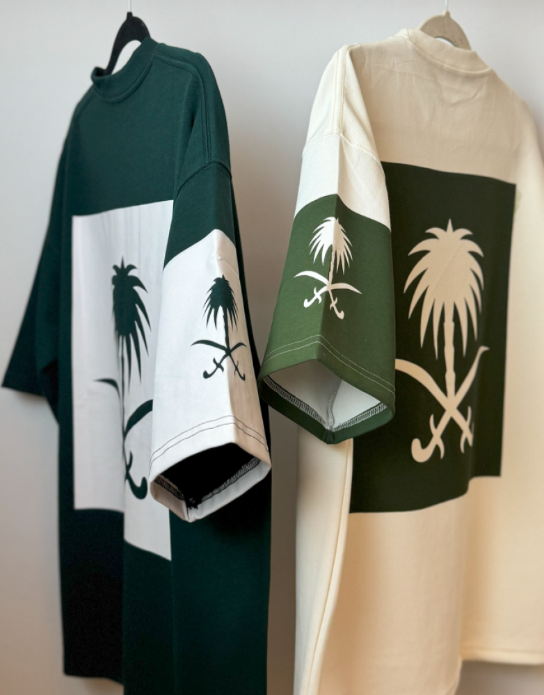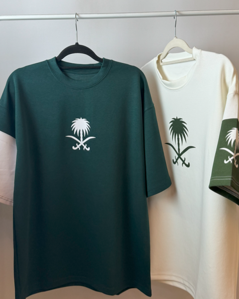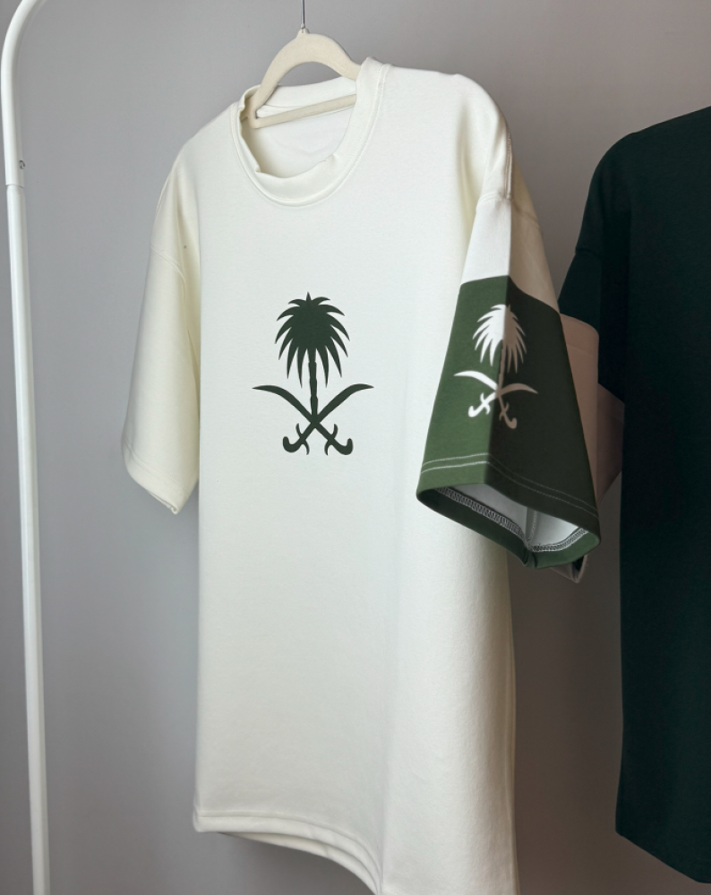 تيشيرت اليوم الوطنيمن الأمام سيفين ونخلةمن الخلف مربع سيفين ونخلةعلى الكم قطعة مختلفة اللون مع سيفين ونخلة.نوع القماش: قطن 100%نوع القصة: اوفر سايز
